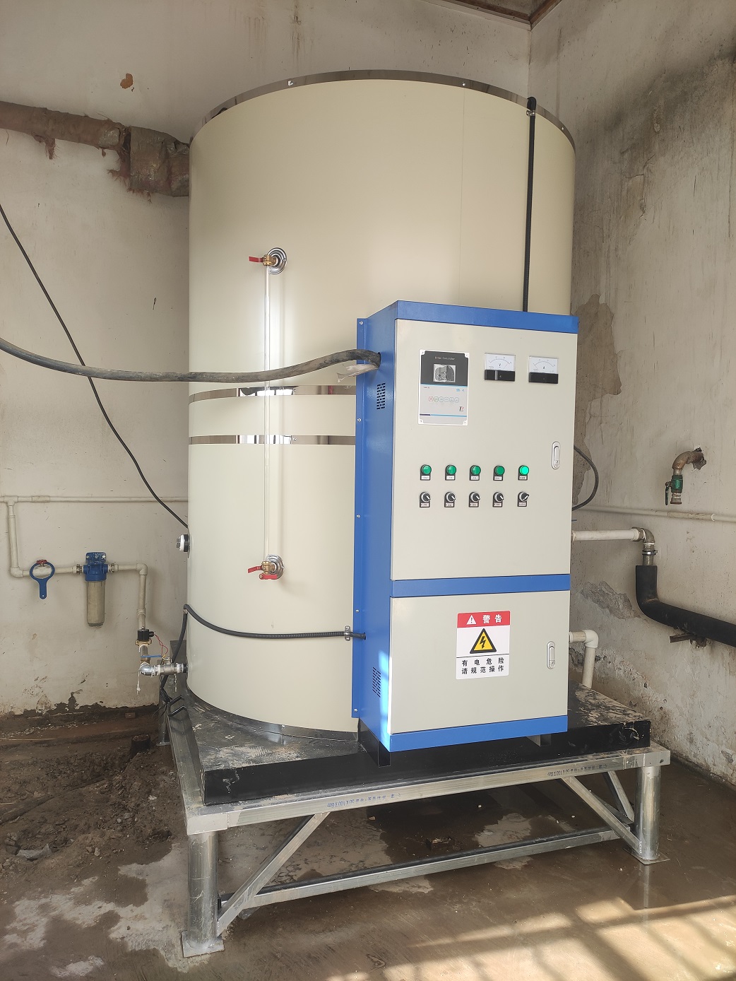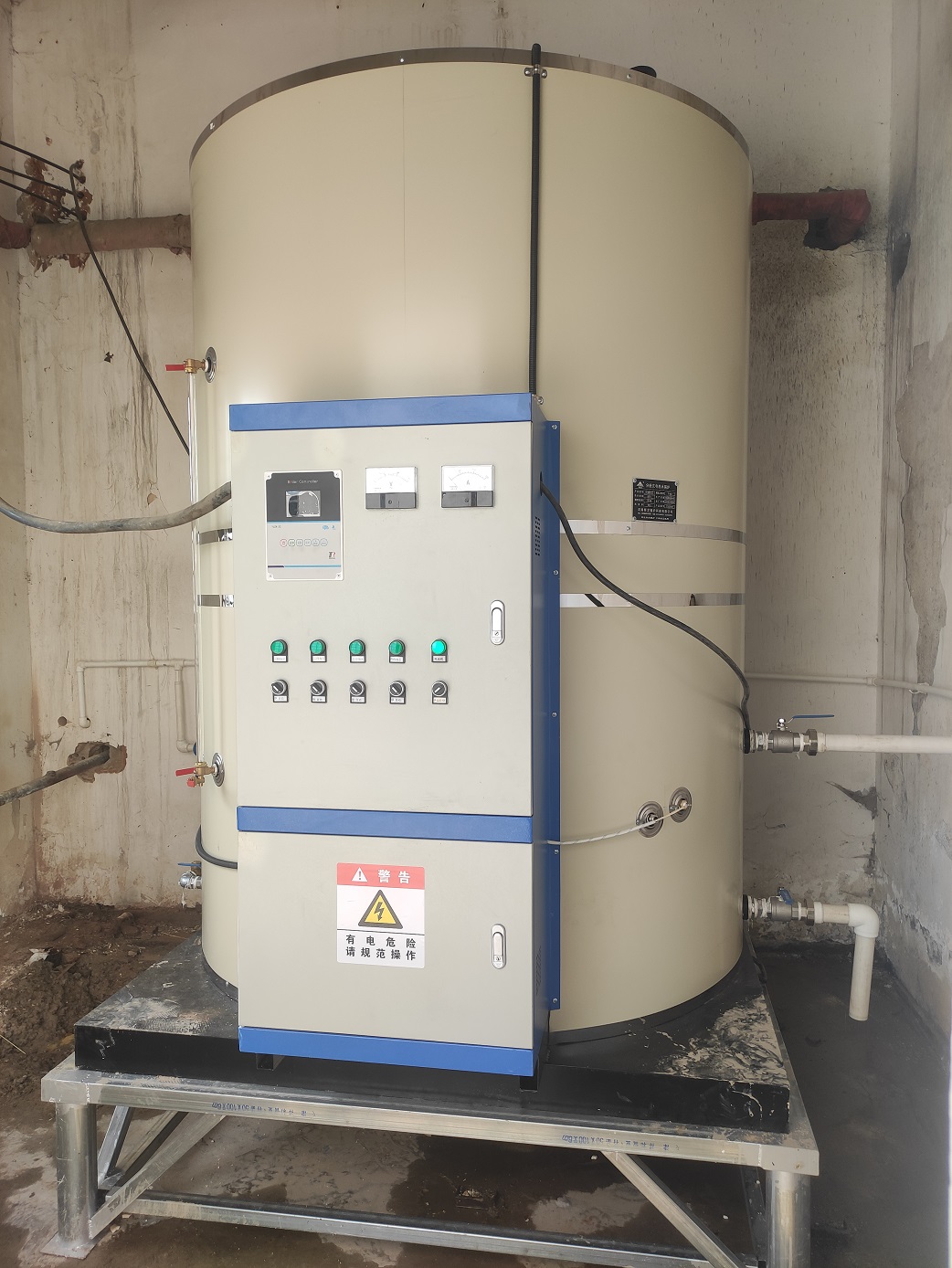 走進甘肅省慶陽市鎮原縣屯字中學的校園,來到學校的開水房,就會迎面看到一臺可大的電開水鍋爐穩座在鐵制的支架上,象牙白色的圓柱形爐體的正前方裝配著一個配套的配電柜,上柜門上鑲嵌著微電腦鍋爐控制器、電壓表、電流表和幾個旋鈕開關及指示燈,下柜門上粘貼著警告標識:“有電危險,請規范操作”,PP棉過濾器、電磁閥、止回閥等相關配件在鍋爐的進水管道上裝著,出水管道則連向屋外,室外的供水管道一下子裝了好多個開水嘴,鍋爐頂部的大氣連通管朝下直豎著,一根黑色的電纜線接到了配電柜內的漏電保護器上,這就是一臺新安裝的3噸72千瓦常壓電開水爐。